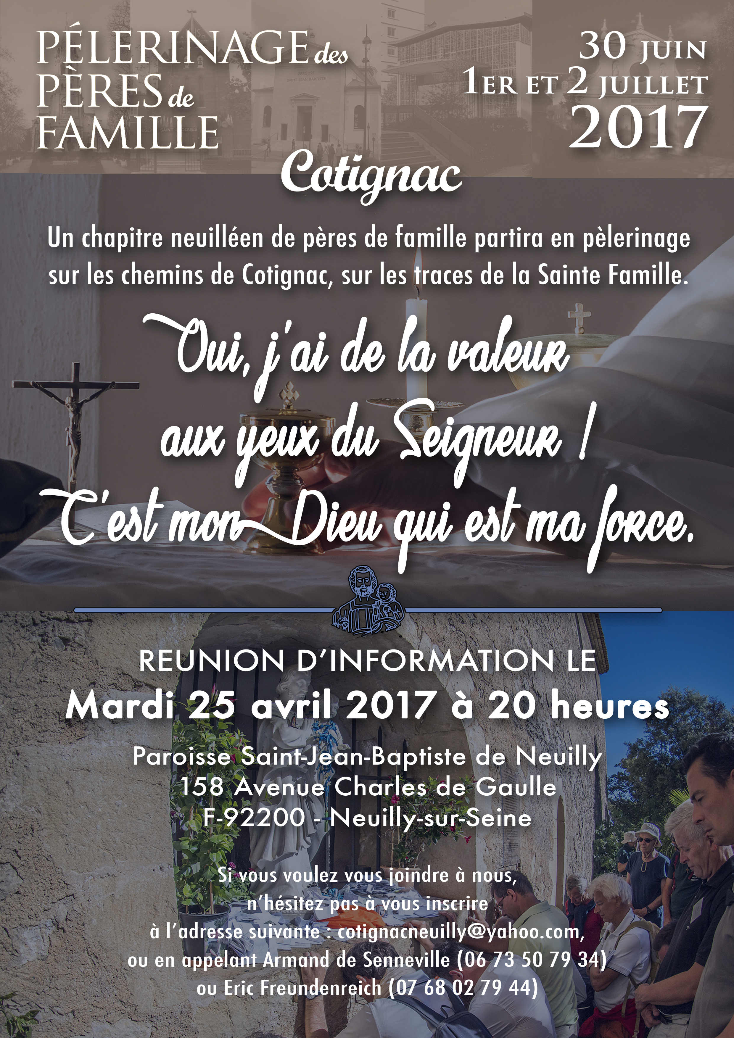 L’école Sainte-Croix et la paroisse Saint-Pierre de Neuilly souhaitent proposer un pèlerinage aux pères de familles : le fameux pèlerinage de Cotignac du jeudi 29 juin (départ en début d’après-midi) au dimanche 2 juillet (retour en début de soirée).